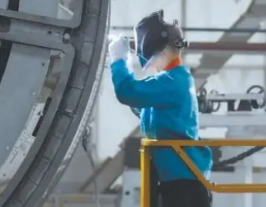 The welding master holds a welding gun and performs welding operations on a certain part. The cabin has many welding parts and complex structural forms. The total length of the weld seam is 50-60 meters, and the shape is irregular, including round and square ones. The welding difficulty is very high. In order to ensure the welding quality, the "seam" quality must be observed at all times during welding. Therefore, the welders stand for several hours at a time, and their bodies are in a very tired state. During the process of walking back and forth on the high-altitude work platform, it is very easy to have accidents of falling from high altitude. Fortunately, every welder wears a speed differential anti fall device and high-altitude work safety belt.